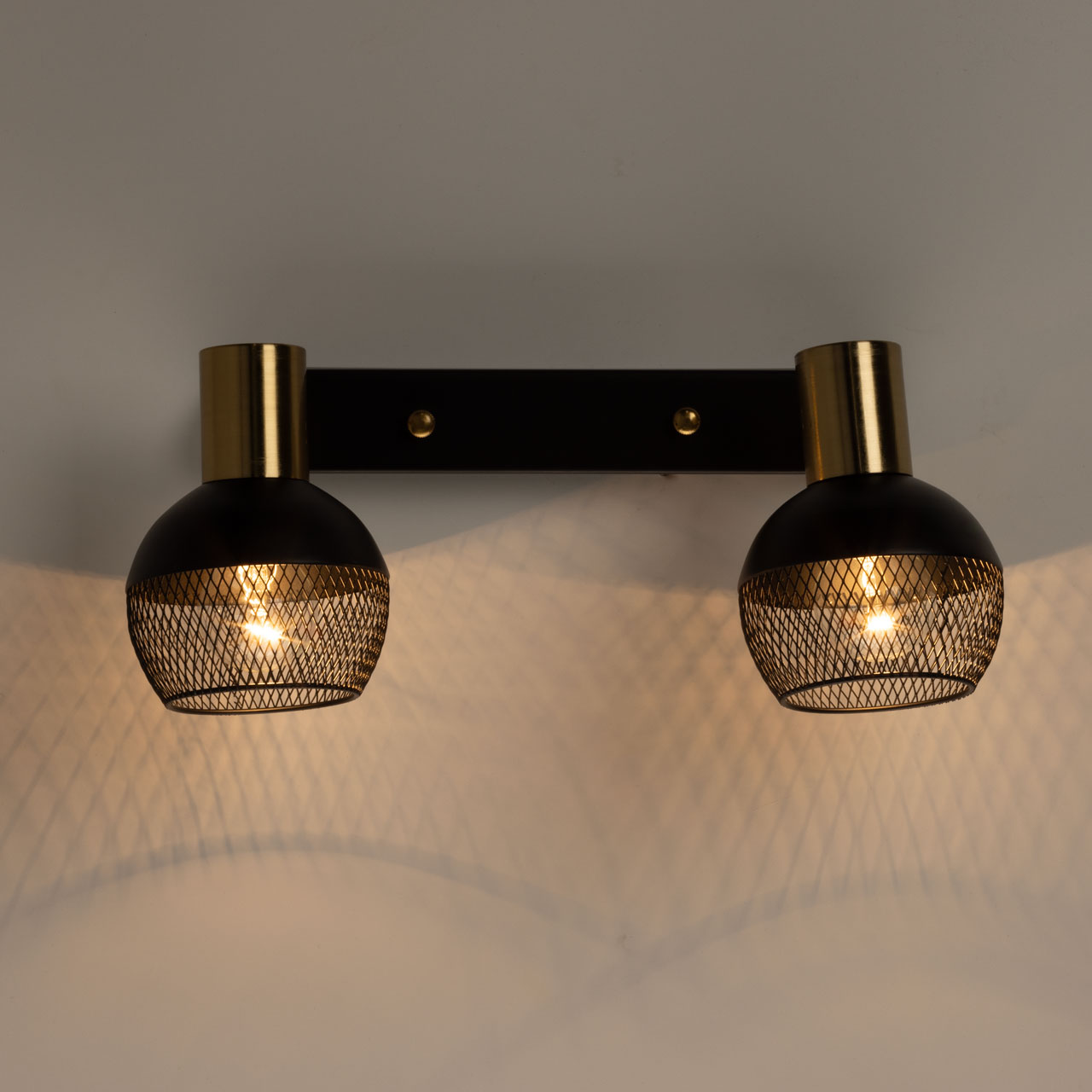 Металлическое основание настенного бра и плафоны окрашены в черный цвет. Отдельные элементы основания гальванизированы в цвет латуни.