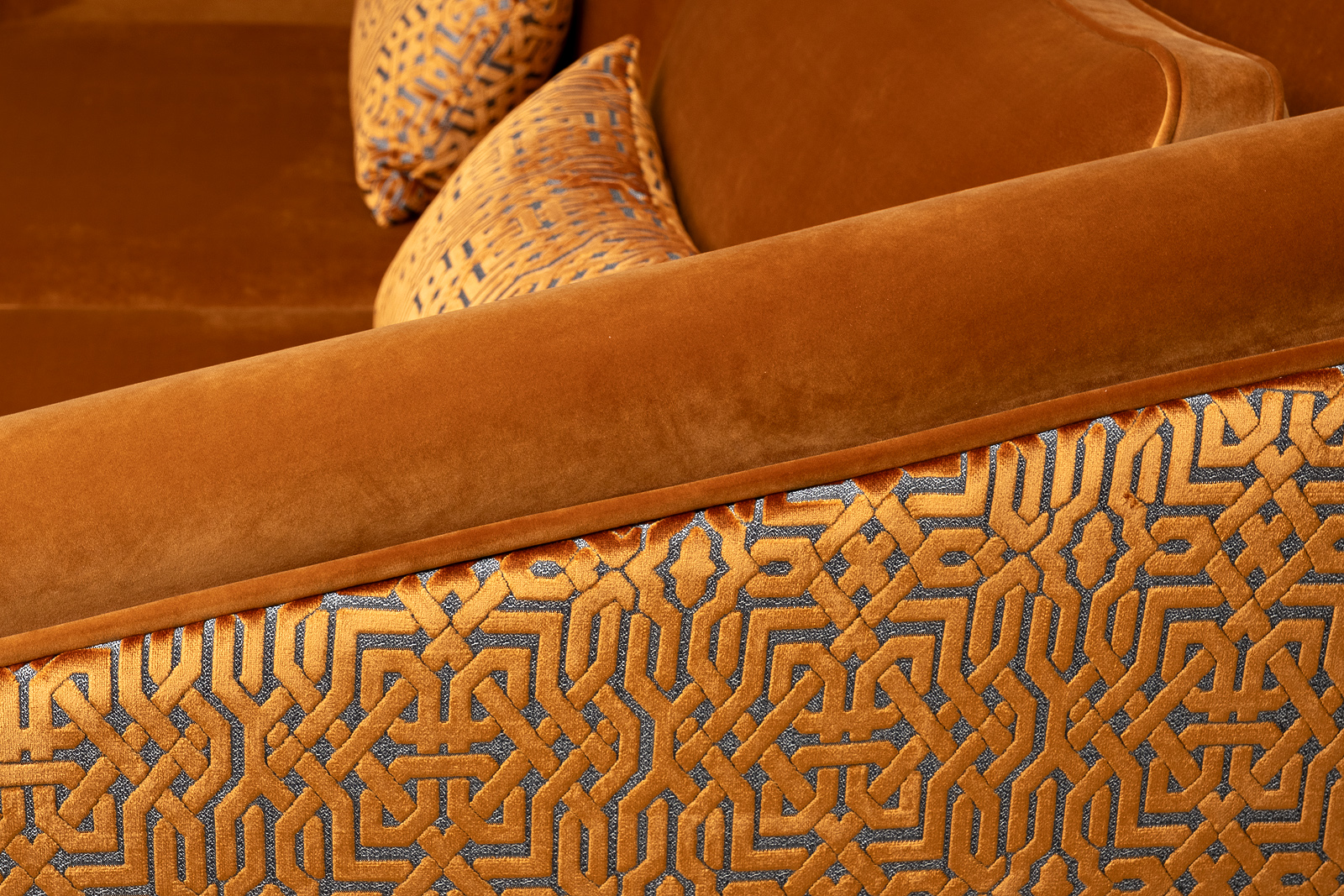 Деревянные опоры, высота 80мм. Образец на фото выполнен в тканях Paddington31G(основная)+Lattice ORANG(задняя часть дивана+прямоугольные декоративные подушки).Передние опоры золото.