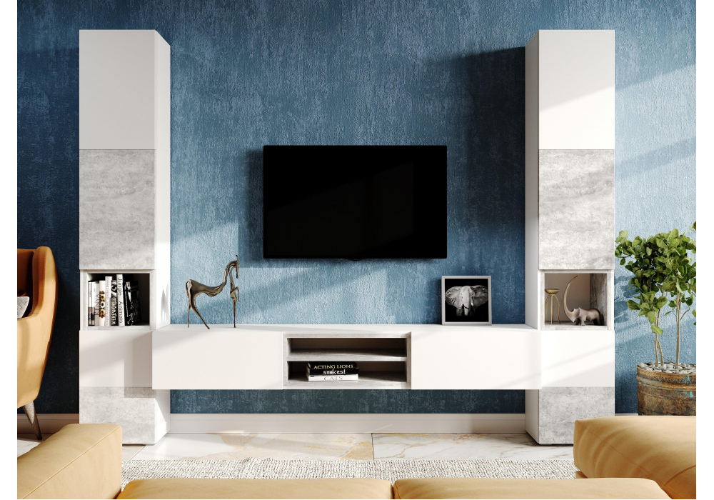 Комплектация гостиной , стеллаж -563527 , тв-тумба -563528 . Материал каркаса - ЛДСП; Цвет каркаса - Белый / бетон светлый; Ширина - 280,4; Глубина - 37; Высота - 217,6