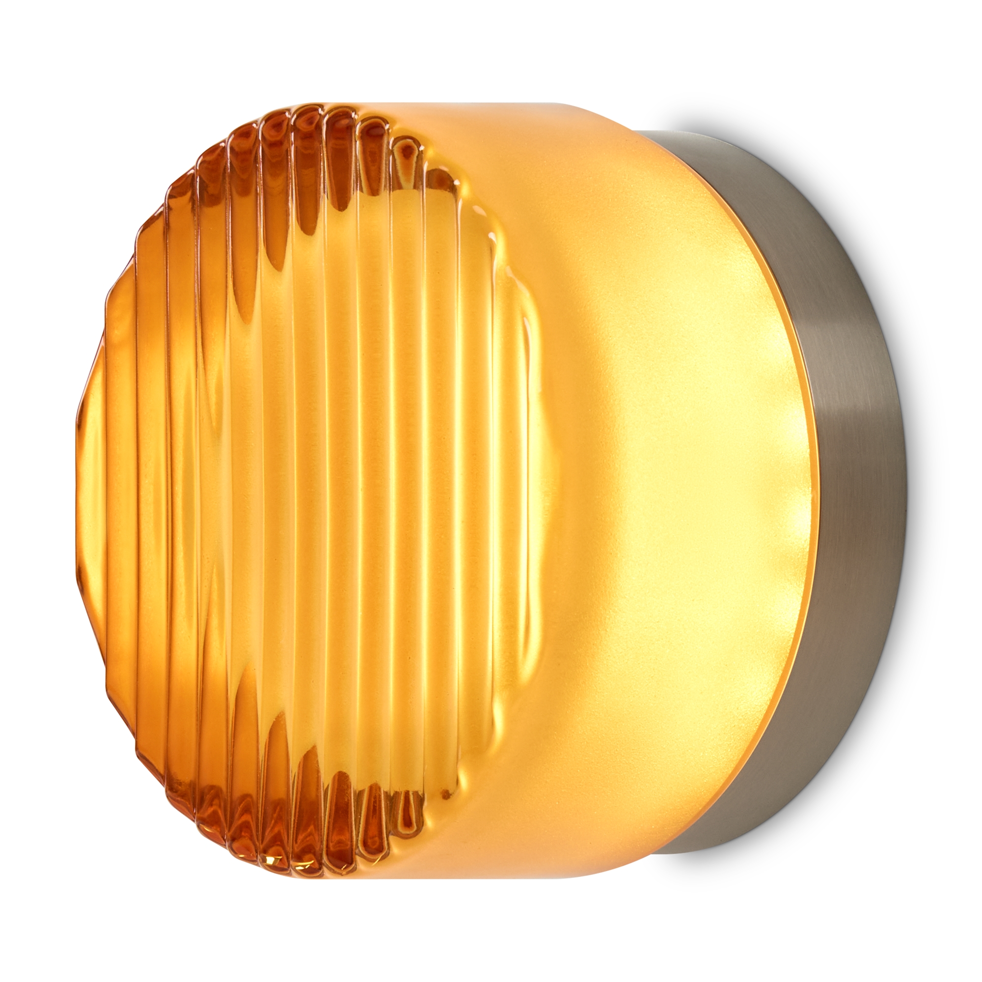 Металлическая арматура в цвете никель в трех рельефных основаниях. Плафоны, выполненные в приглушенно пшеничном и янтарном оттенках, доступны в двух размерах. LED источник света 2400К/2550К/3000K.