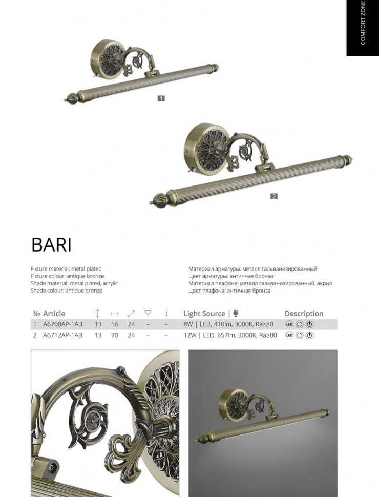 Подсветка для картин Arte Lamp A6708AP-1AB, входящая в серию Bari, отлично подойдет для освещения пространства над зеркалом или картиной на кухне, на даче, в гардеробной, в прихожей, в кабинете, оформленных в классическом стиле или в стиле Флористика. Данный спот имеет один металлический бронзовый плафон, выполненный в форме цилиндра и направленный вниз, вверх или в стороны, в зависимости от расположения на стене, оснащенный поворотным механизмом, и матовым белым рассеивателем, а также фактурную арматуру в цвете античная бронза, изготовленную из гальванизированного металла. Итальянский производитель Arte Lamp дает гарантию на свое изделие 1 год и обращает внимание на то, что осветительный элемент с цоколем LED встроен в конструкцию и не требует приобретения дополнительных лампочек, а общая мощность светильника составляет 8 Вт, что эквивалентно лампе накаливания мощностью 35 Вт и позволяет осветить помещение площадью 2 кв. м. Общий световой поток составляет 410 Лм, а индекс цветопередачи равен 80 Ra. Технической особенностью этого осветительного прибора является наличие поворотного плафона, а также выключателя на корпусе. Цветовая температура равна 3000 К, что делает атмосферу в вашем интерьере более уютной. Способ крепления подсветки к стене на планку позволяет быстро и просто осуществить монтаж светильника. Классический дизайн, фактурная поверхность античной бронзы и теплая цветовая температура подсветки для картин Arte Lamp A6708AP-1AB, делают ее особенным элементом декора, который украсит любое интерьерное пространство.