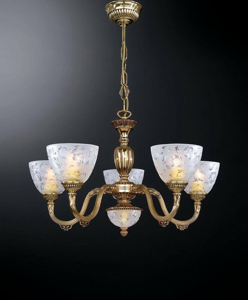 Подвесная люстра Reccagni Angelo L 6352/5 Итальянского производсва – отличный выбор для Вас. Этот светильник Классического стиля хорошо подойдет Для спальни и придаст помещению мягкий и приятный свет. Плафоны белые из стекла. Арматура золотая из металла. Кол-во ламп - 5шт. Общая мощность 300W