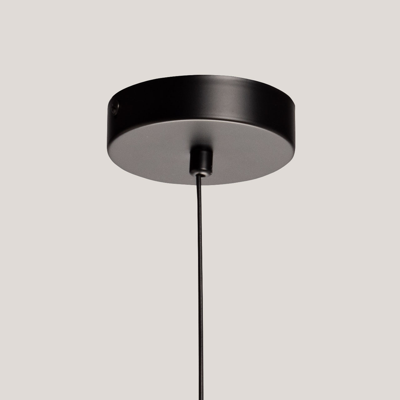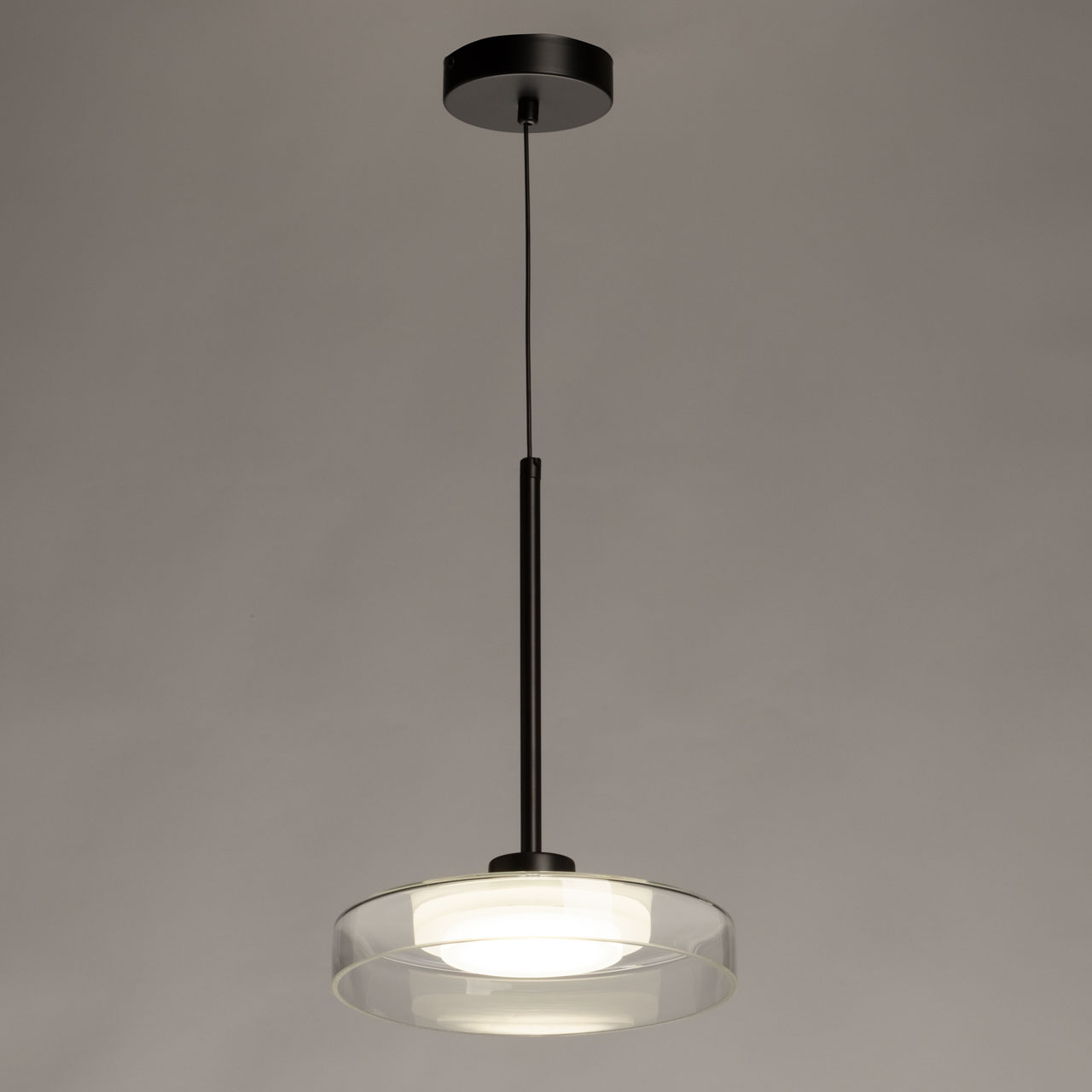 Металлическое основание светильника окрашено в черный цвет. Светодиодный источник света закрыт белым матовым акрилом. Люстра декорирована плафоном из прозрачного стекла.