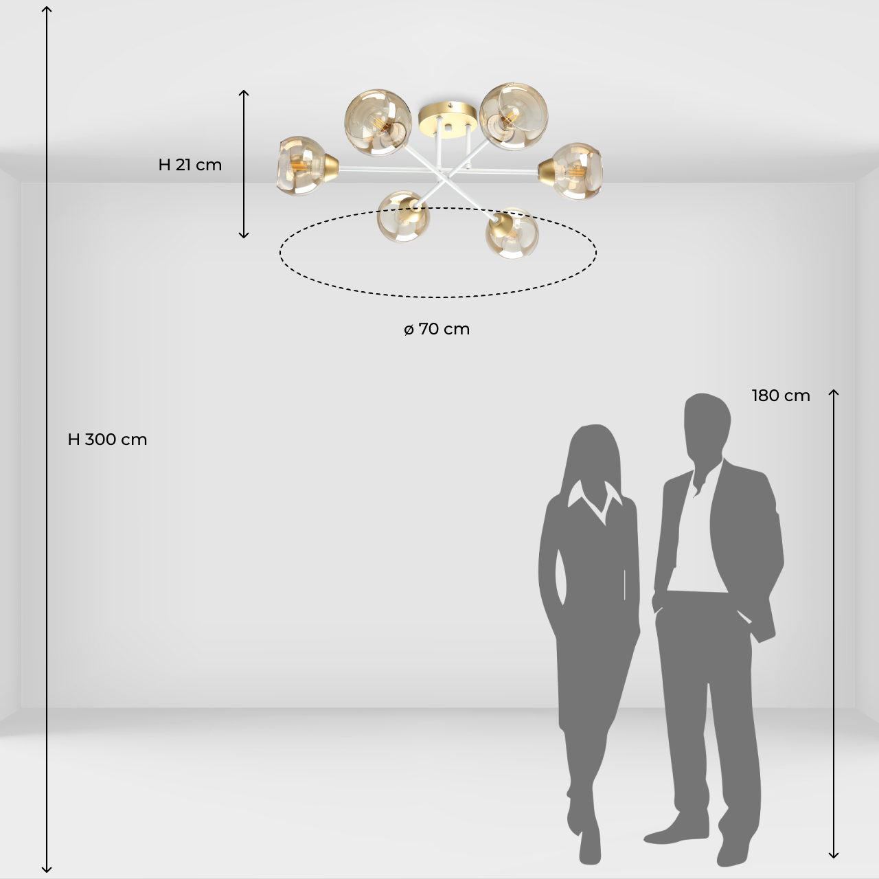 Металлическое основание потолочного светильника гальванизировано в цвет матового золота. Отдельные элементы окрашены в белый цвет. Светильник декорирован стеклянными плафонами, гальванизированными в цвет шампань.