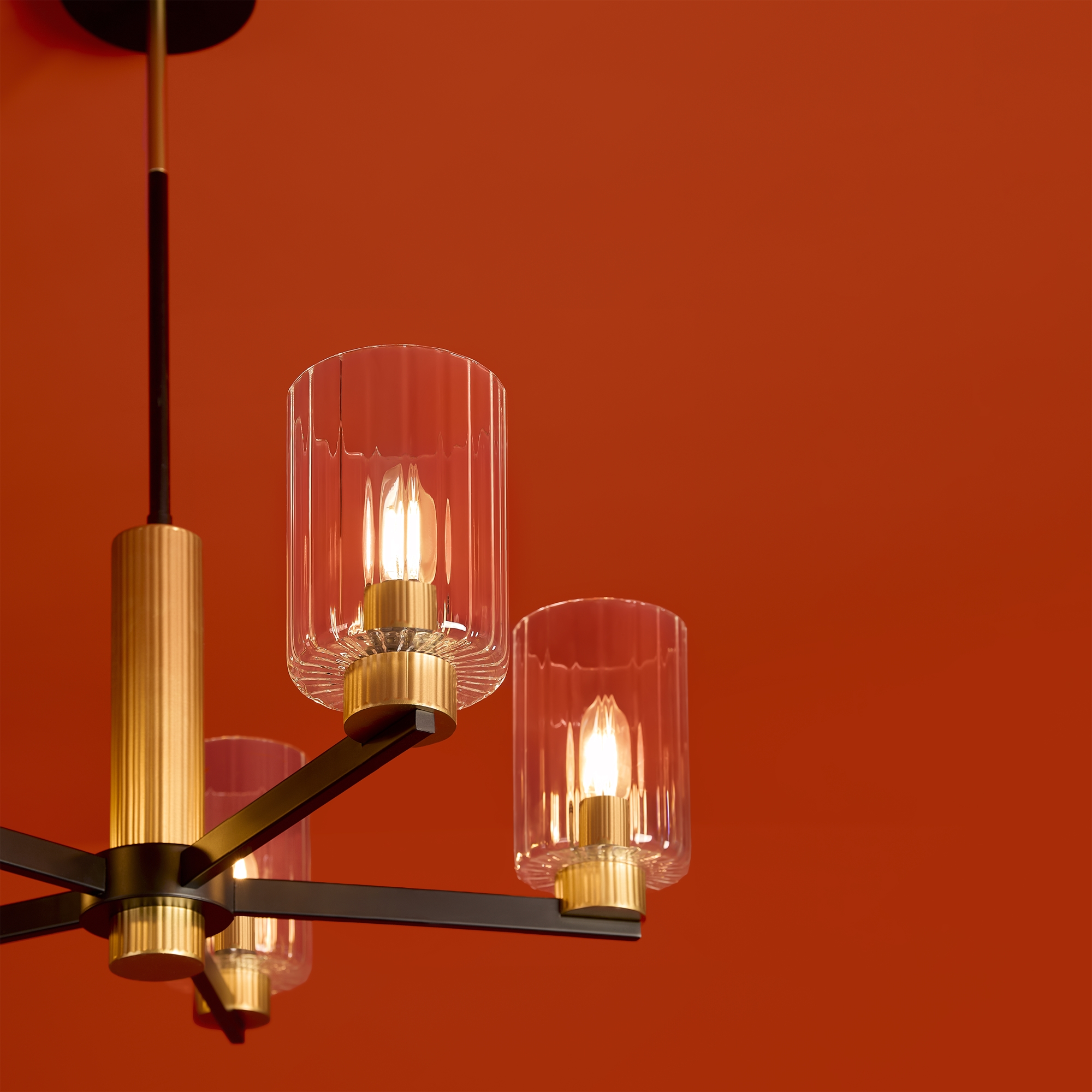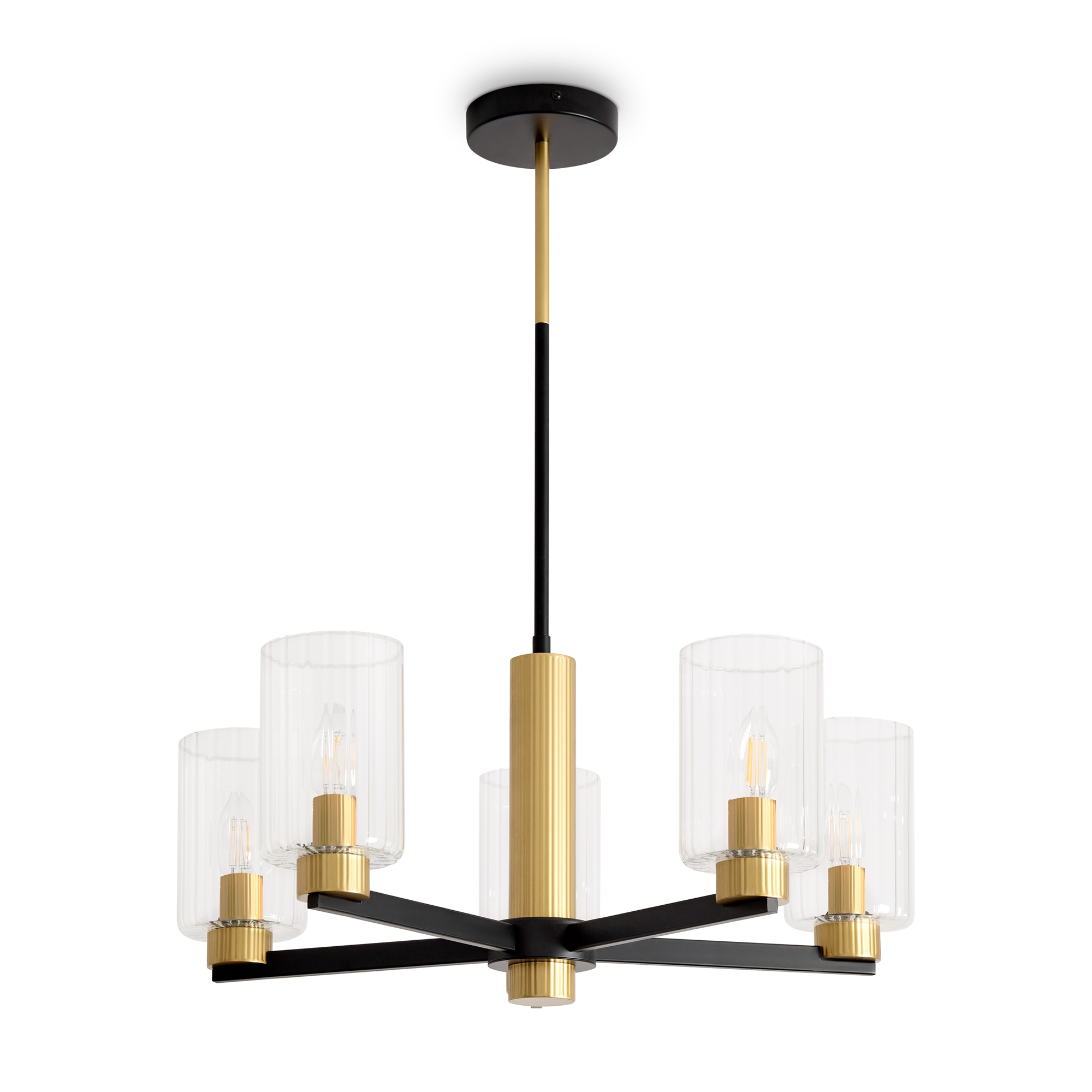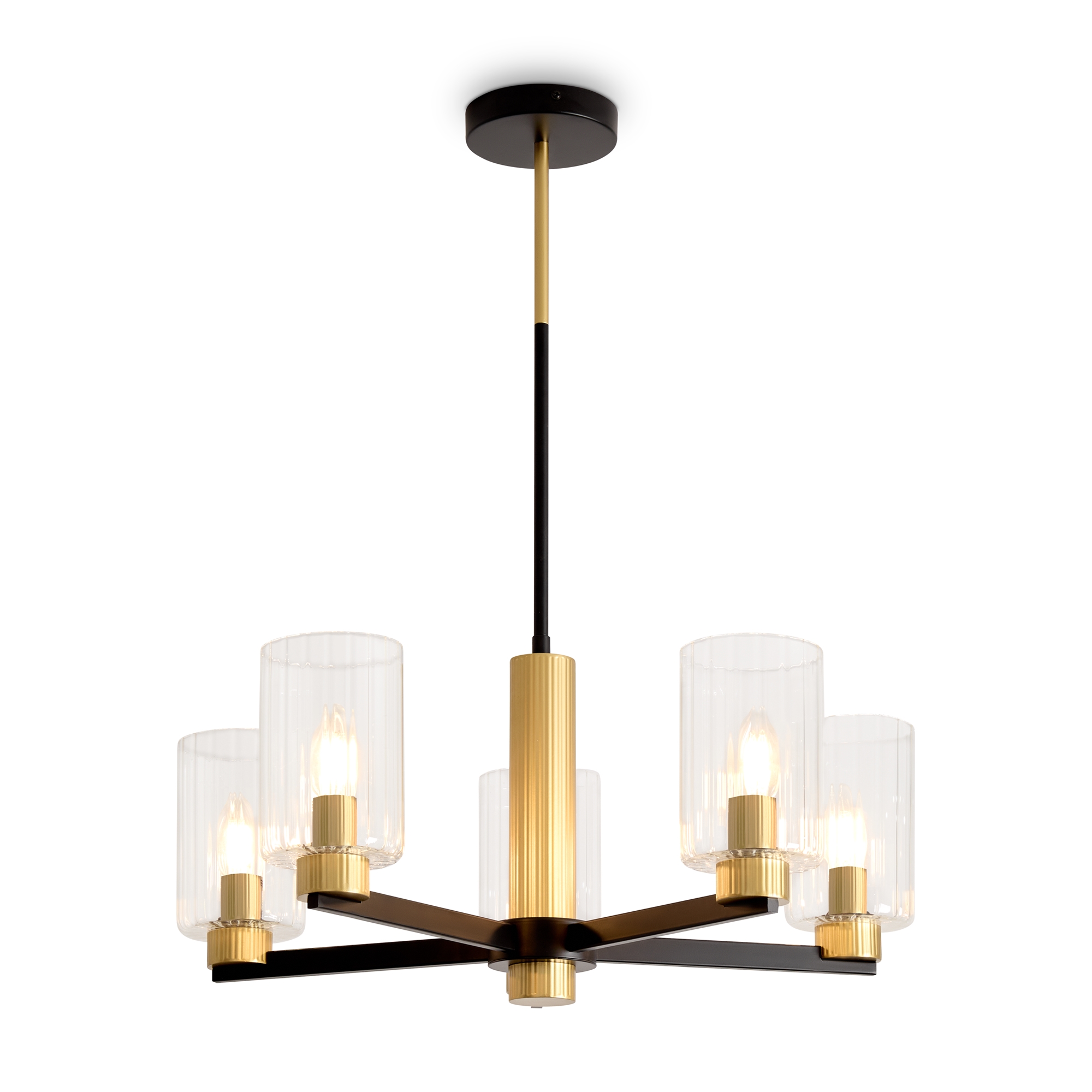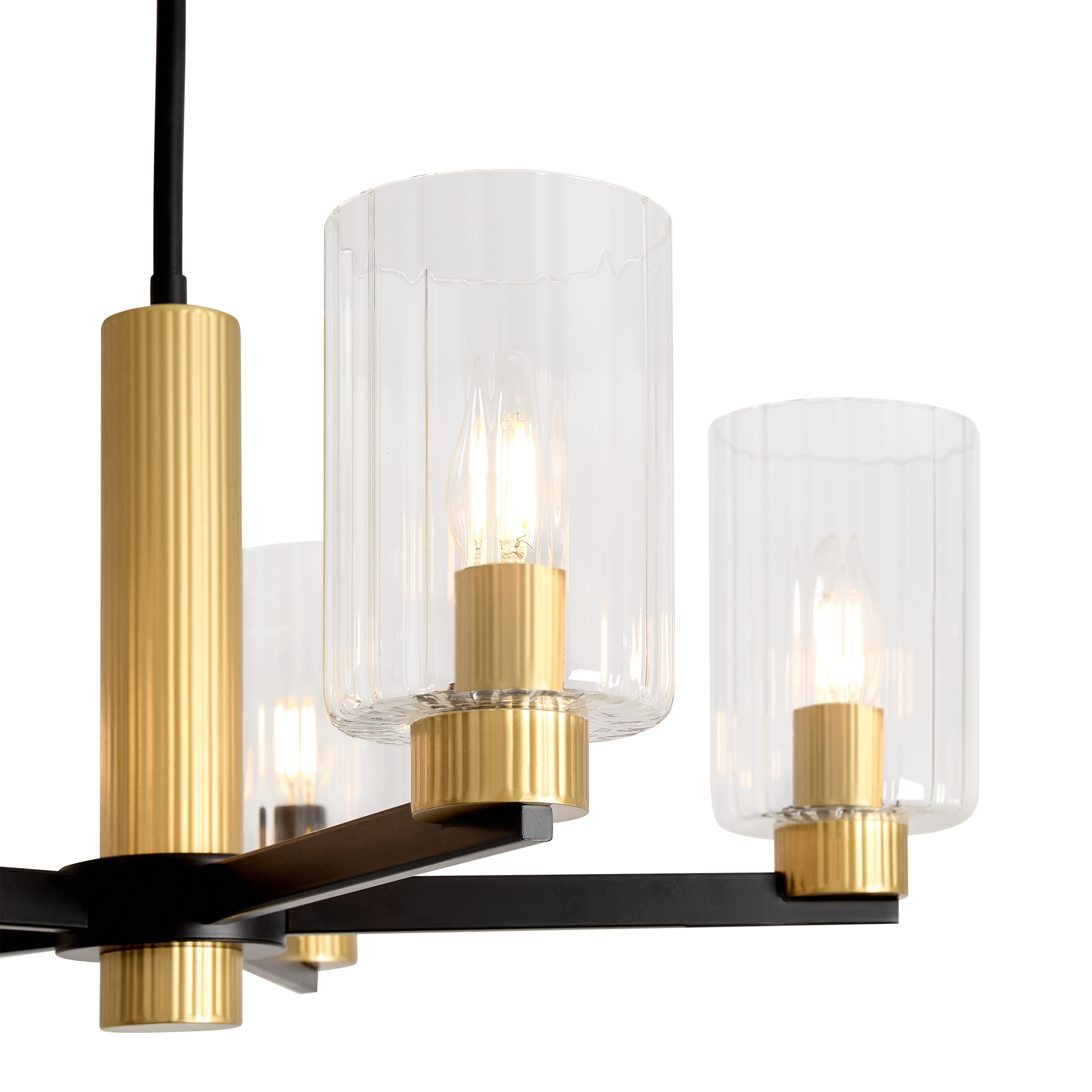 Металлическая арматура чёрного матового цвета с латунными вставками. Прозрачные цилиндрические стеклянные абажуры. Лампы E14 (не включены). Трендовое сочетание для современных интерьеров.