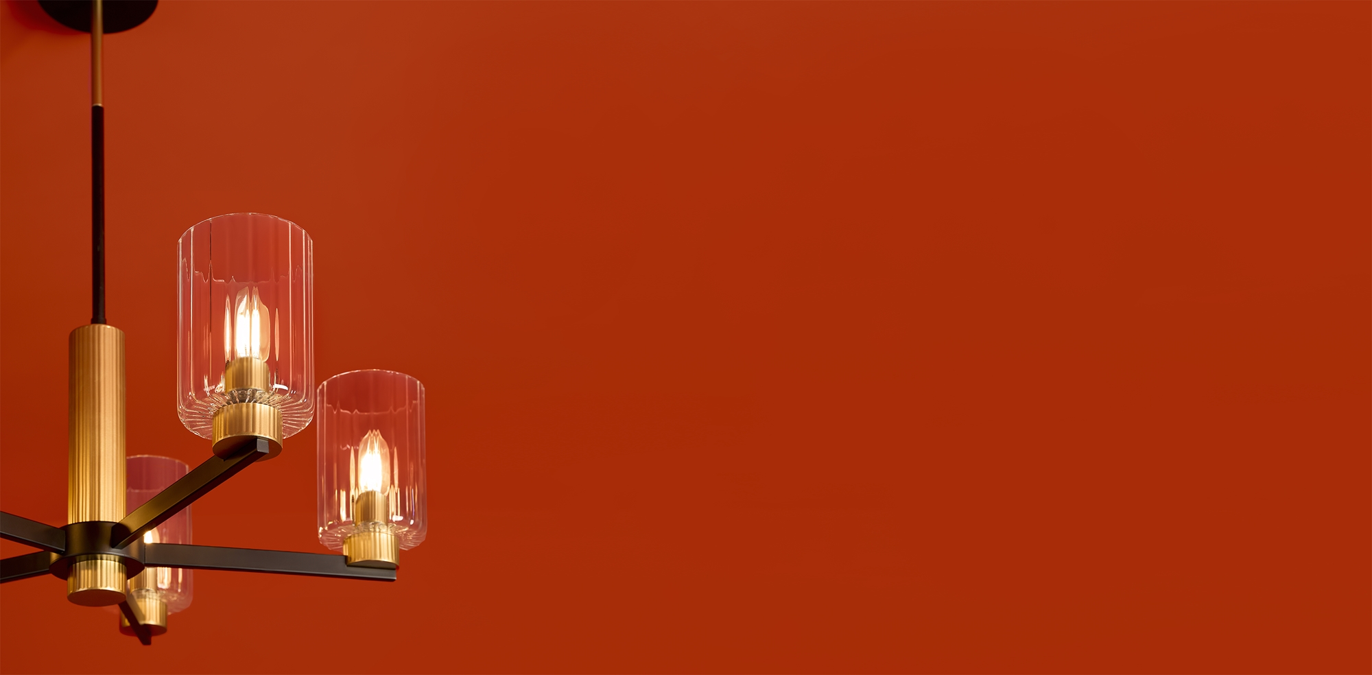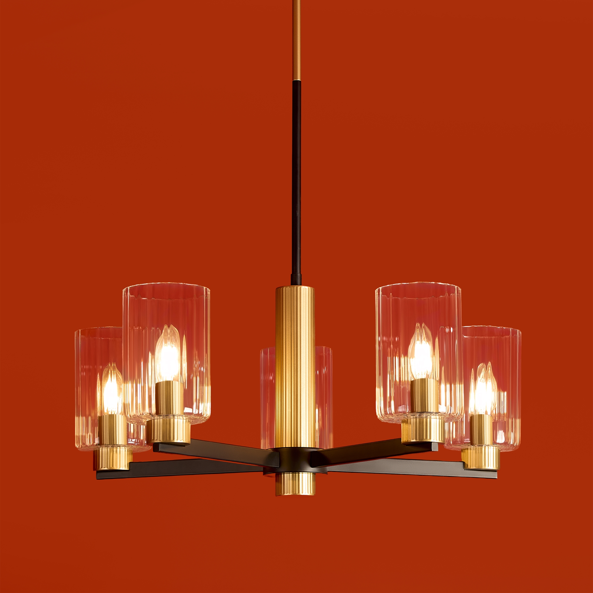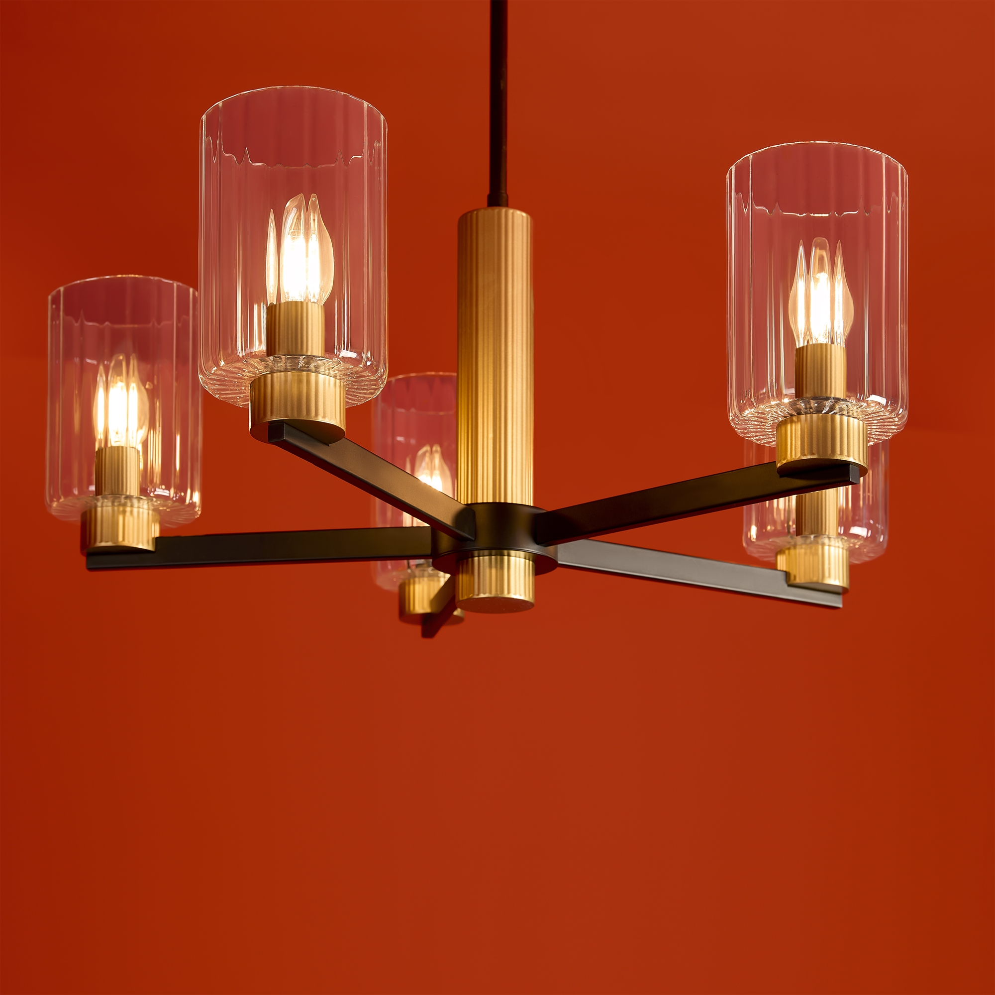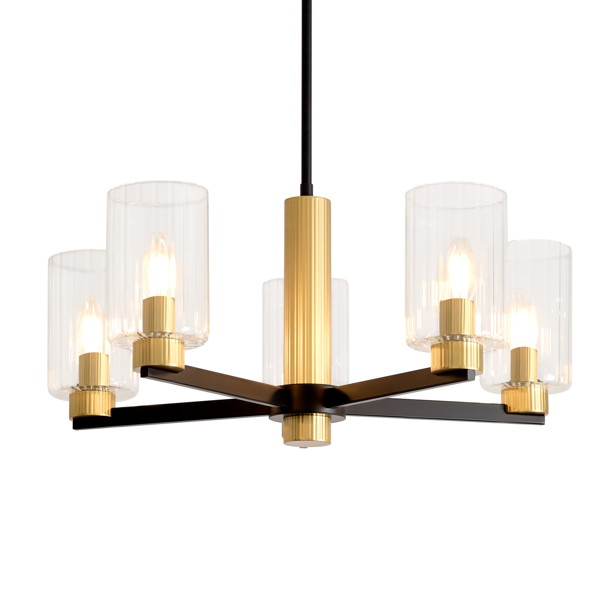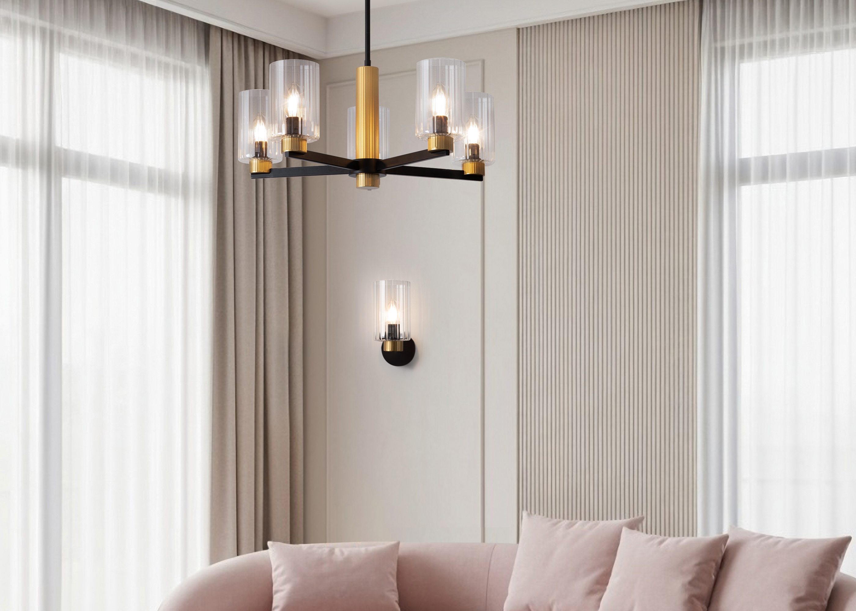 Металлическая арматура чёрного матового цвета с латунными вставками. Прозрачные цилиндрические стеклянные абажуры. Лампы E14 (не включены). Трендовое сочетание для современных интерьеров.