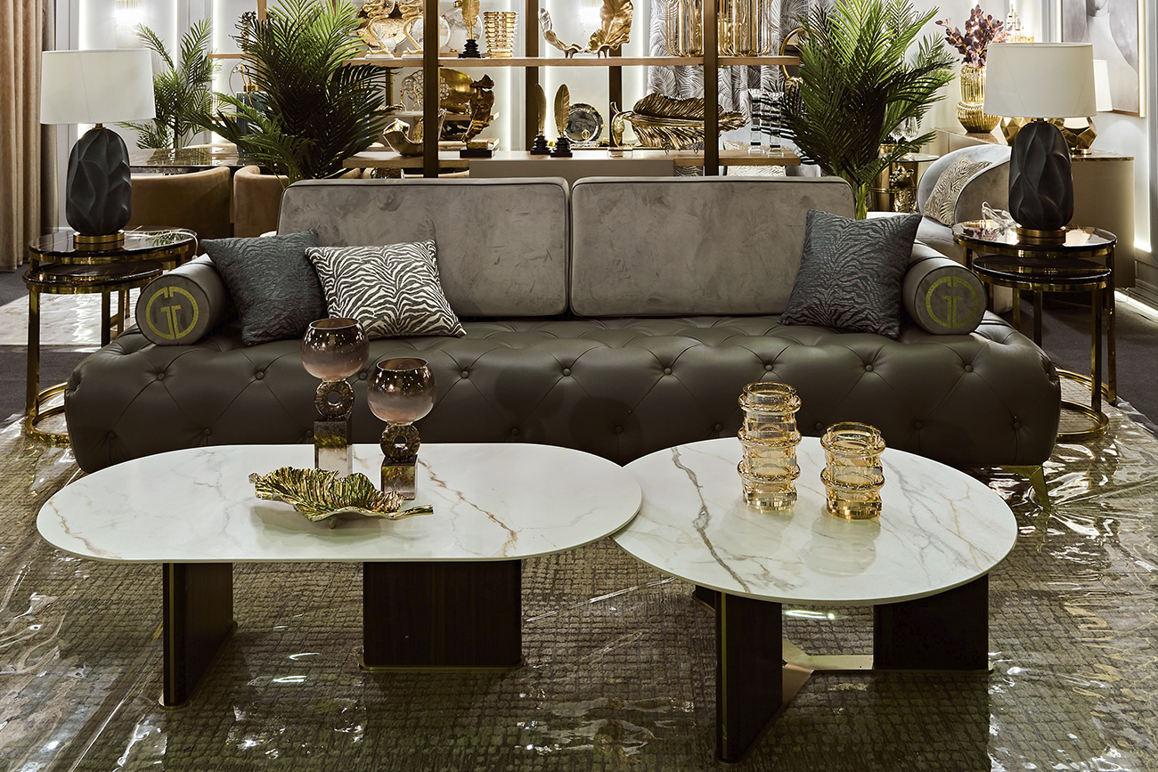 Элегантный круглый столик для гостиной или зоны отдыха, в котором сочетаются три стихии - камень, дерево и металл. Столешница изготовлена из прессованного при высокой температуре керамогранита, что обеспечивает высокую степень надежности и износостойкости. Опора из древесной плиты высокого давления (HDF) с отделкой из шпона, с акцентом на золотое основание.